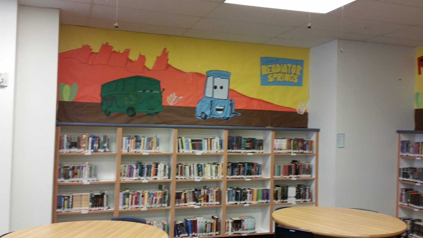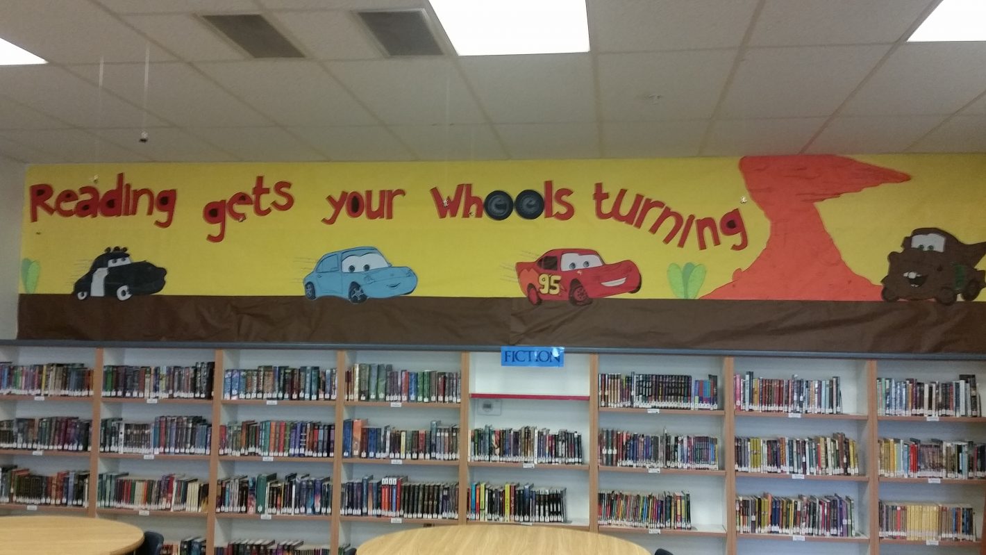 The theme of the library this year is...READING GETS YOUR WHEELS TURNING...so, when students read a book, they fill out a reading ticket and then turn it in to their teacher (each teacher has a little box to hold all the tickets that are turned in.)