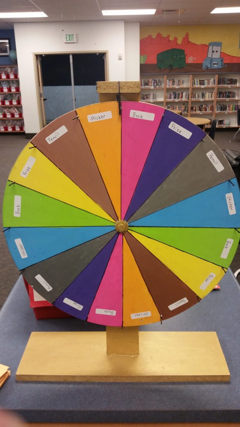 Then once a month when their class comes to library time...I will draw several reading tickets out of the classroom box, and then those students will get to spin the wheel. They can win a book, a "prize" ( I got some free small toys from a company), a pencil, or sticker, depending on where the wheel stops.